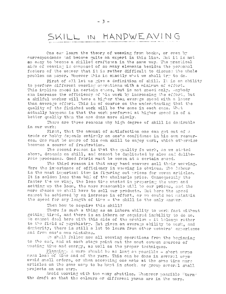 Skill in Handweaving, ---. Master Weaver, No. 12 November 1953, 7 pages. Note: PDF provided by Judith Combs. By permission. Posted July 15, 2006. SAMPLE PAGE. File size 1.16 MB PDF