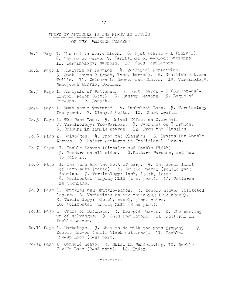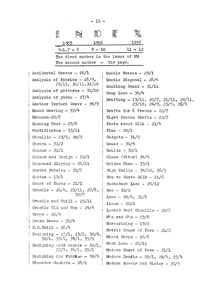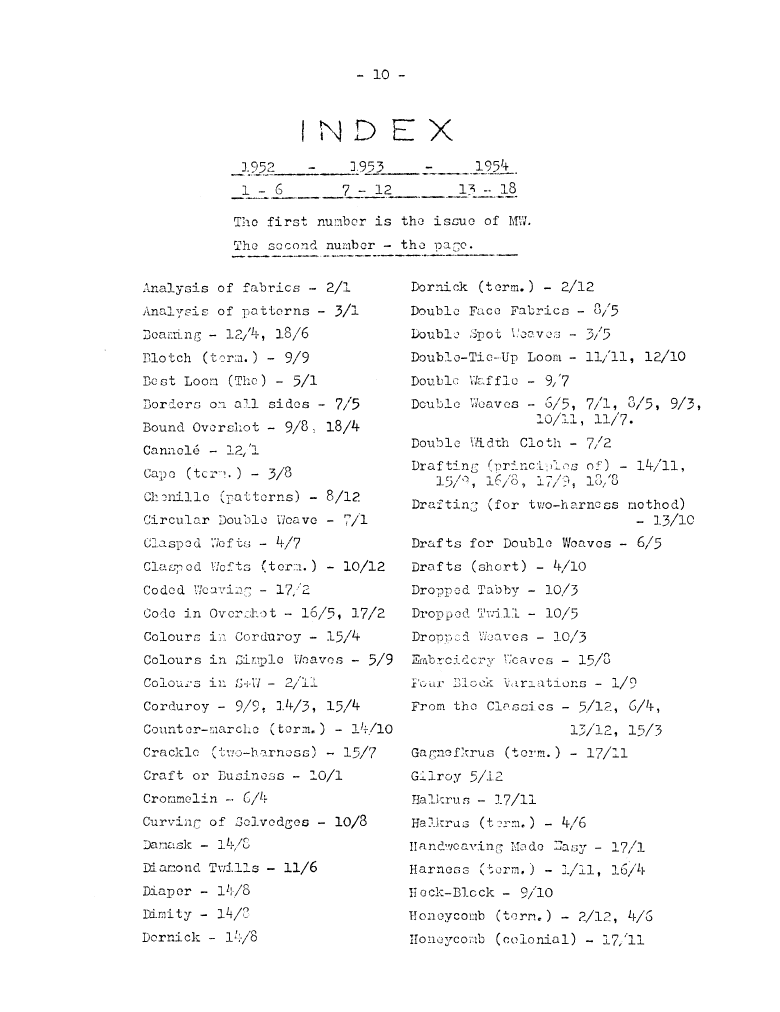 Index, ---. Master Weaver, No. 36 November 1957, 2 pages. Note: PDF provided by Judith Combs. By permission. Posted July 15, 2006. SAMPLE PAGE. File size 511 KB PDF