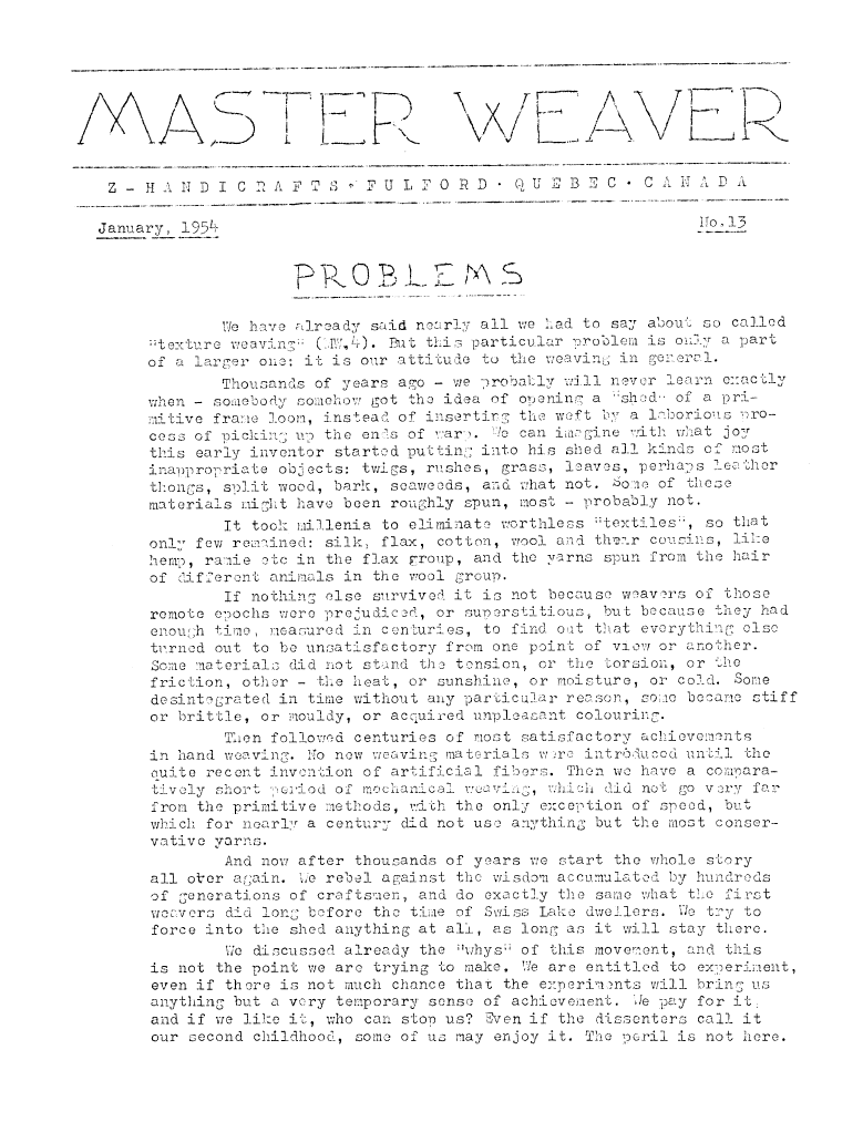 Rep, ---. Master Weaver, No. 32 March 1957, 4 pages. Note: PDF provided by Judith Combs. By permission. Posted July 15, 2006. SAMPLE PAGE. File size 727 KB PDF