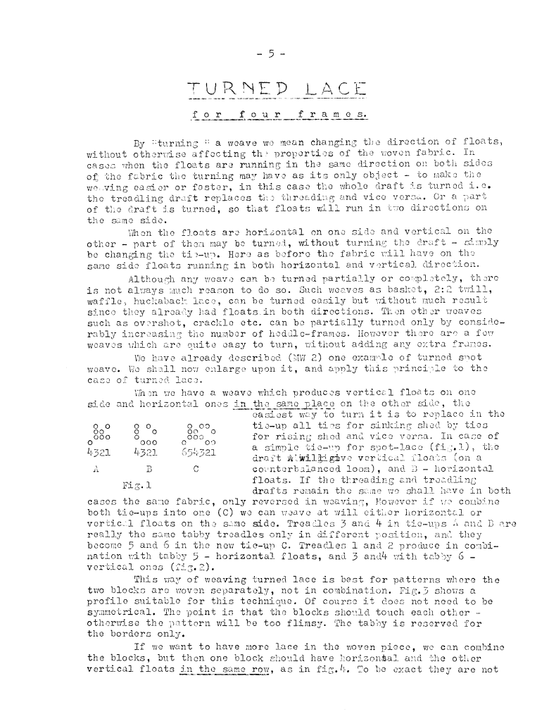 Turned Lace for Four Frames, ---. Master Weaver, No. 13 January 1954, 3 pages. Note: PDF provided by Judith Combs. By permission. Posted July 15, 2006. SAMPLE PAGE. File size 675 KB PDF