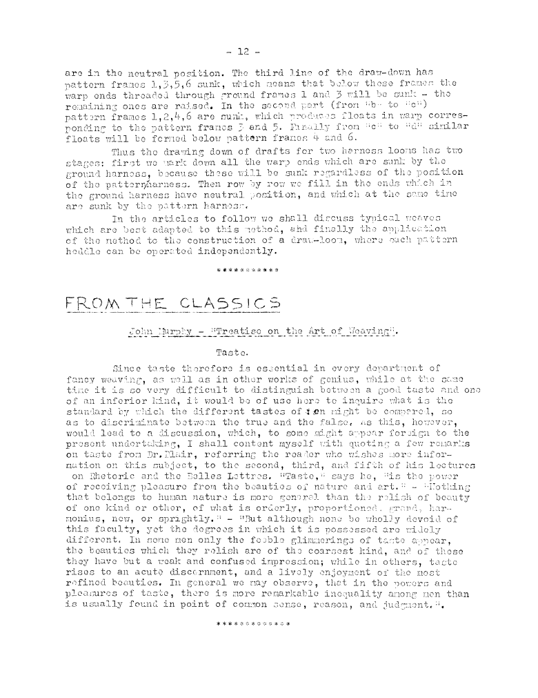 From the Classics: Treatise on the Art of Weaving - Taste, Murphy, John. Master Weaver, No. 13 January 1954, 1 page. Note: PDF provided by Judith Combs. By permission. Posted July 15, 2006. SAMPLE PAGE. File size 501 KB PDF