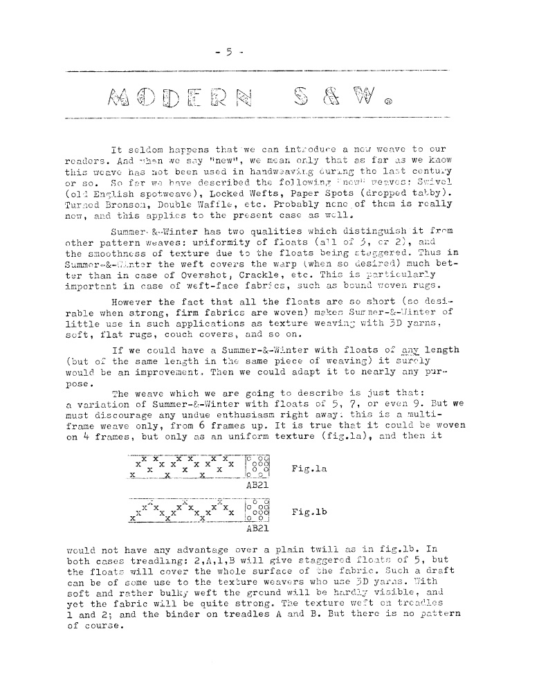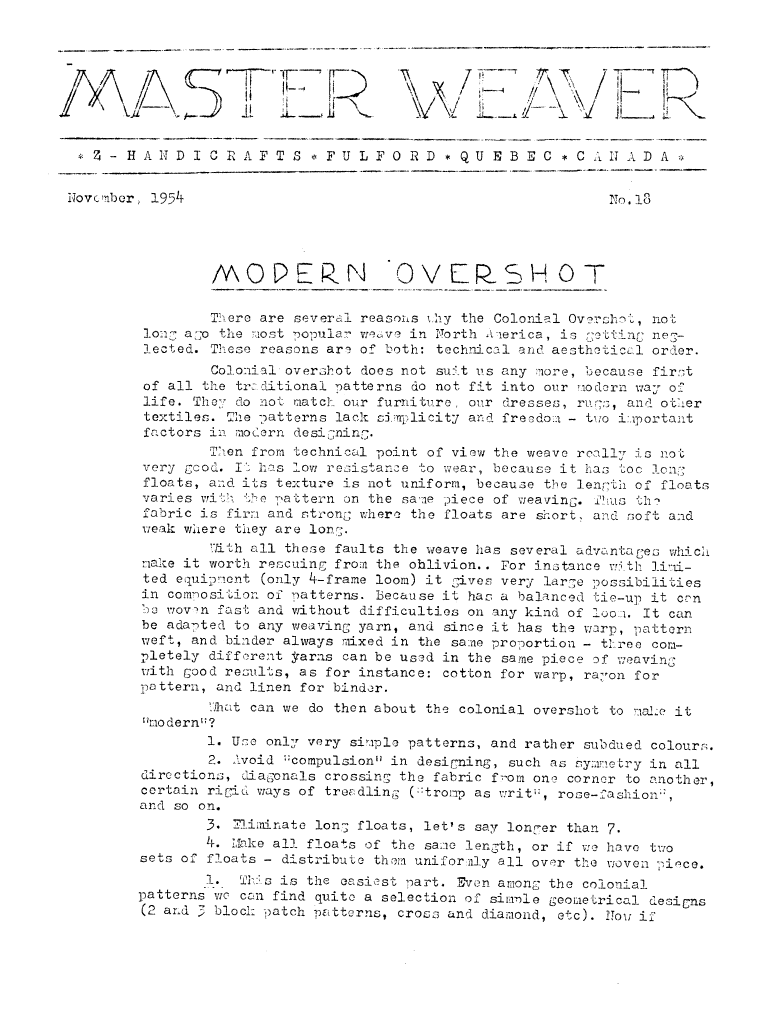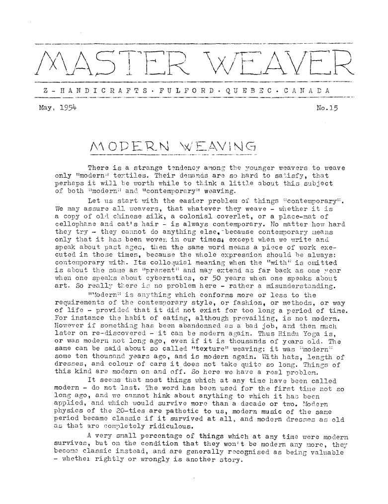 Modern Patterns in Traditional Weaves, ---. Master Weaver , October 1952, 4 pages. Note: PDF provided by Maury Logue. Posted July 7, 2006. SAMPLE PAGE. File size 2 MB PDF