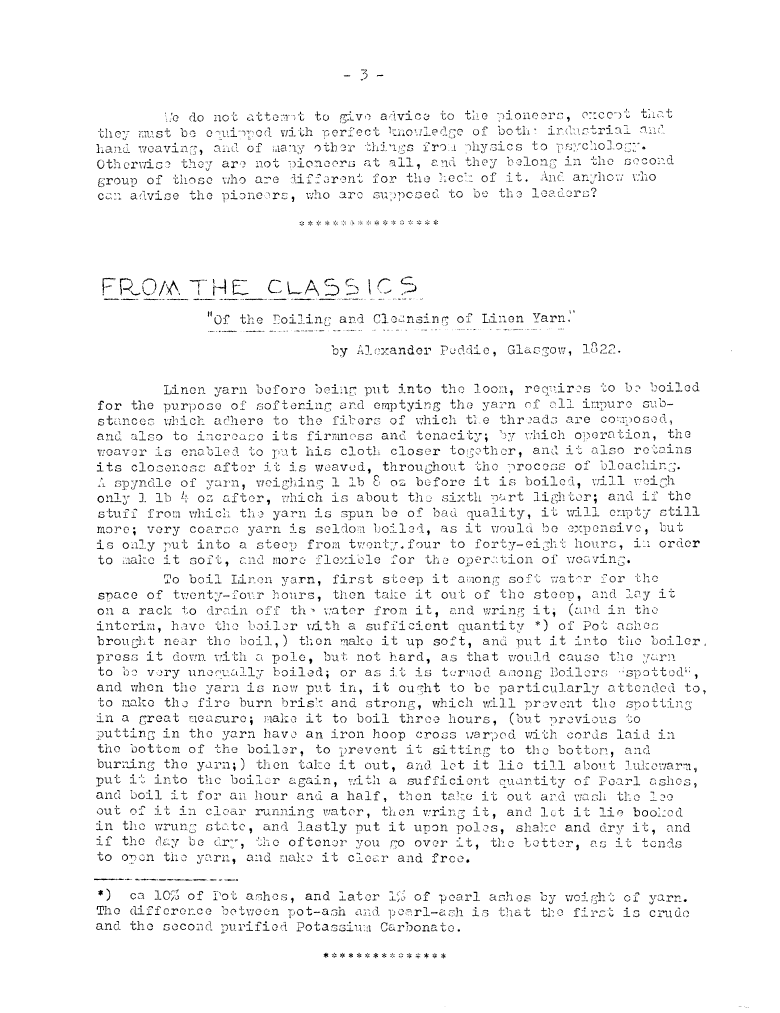 From the Classics: Of the Boiling and Cleansing of Linen Yarn (1822), Poddie, Alexander. Master Weaver, No. 15 May 1954, 1 page. Note: PDF provided by Judith Combs. By permission. Posted July 15, 2006. SAMPLE PAGE. File size 509 KB PDF