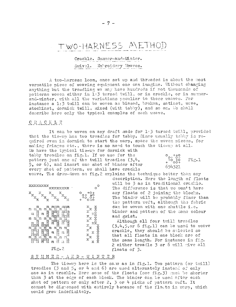Two Harness Method - Crackle, Summer-and-Winter, Swivel, Embroidery Weaves, ---. Master Weaver, No. 15 May 1954, 2 pages. Note: PDF provided by Judith Combs. By permission. Posted July 15, 2006. SAMPLE PAGE. File size 544 KB PDF