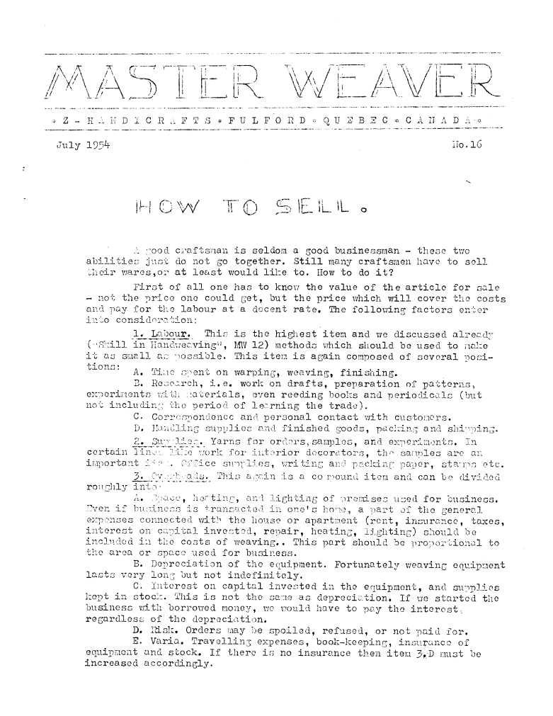 How to Sell, ---. Master Weaver, No. 16 July 1954, 4 pages. Note: PDF provided by Judith Combs. By permission. Posted July 15, 2006. SAMPLE PAGE. File size 809 KB PDF