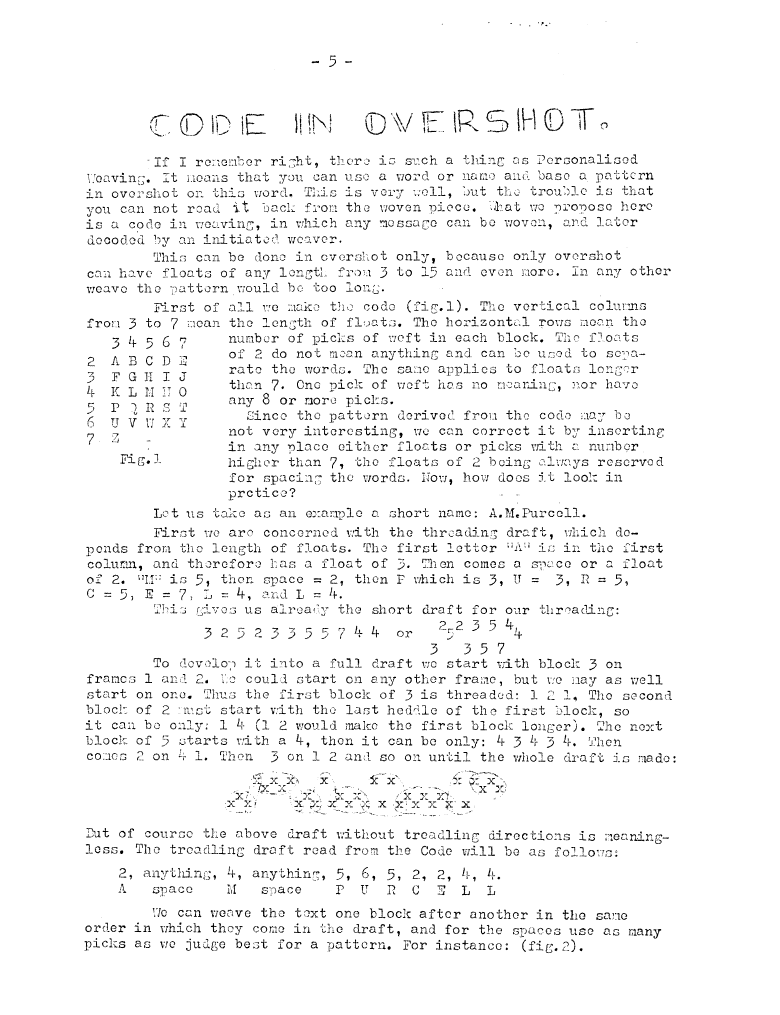 Code in Overshot, ---. Master Weaver, No. 16 July 1954, 3 pages. Note: PDF provided by Judith Combs. By permission. Posted July 15, 2006. SAMPLE PAGE. File size 686 KB PDF