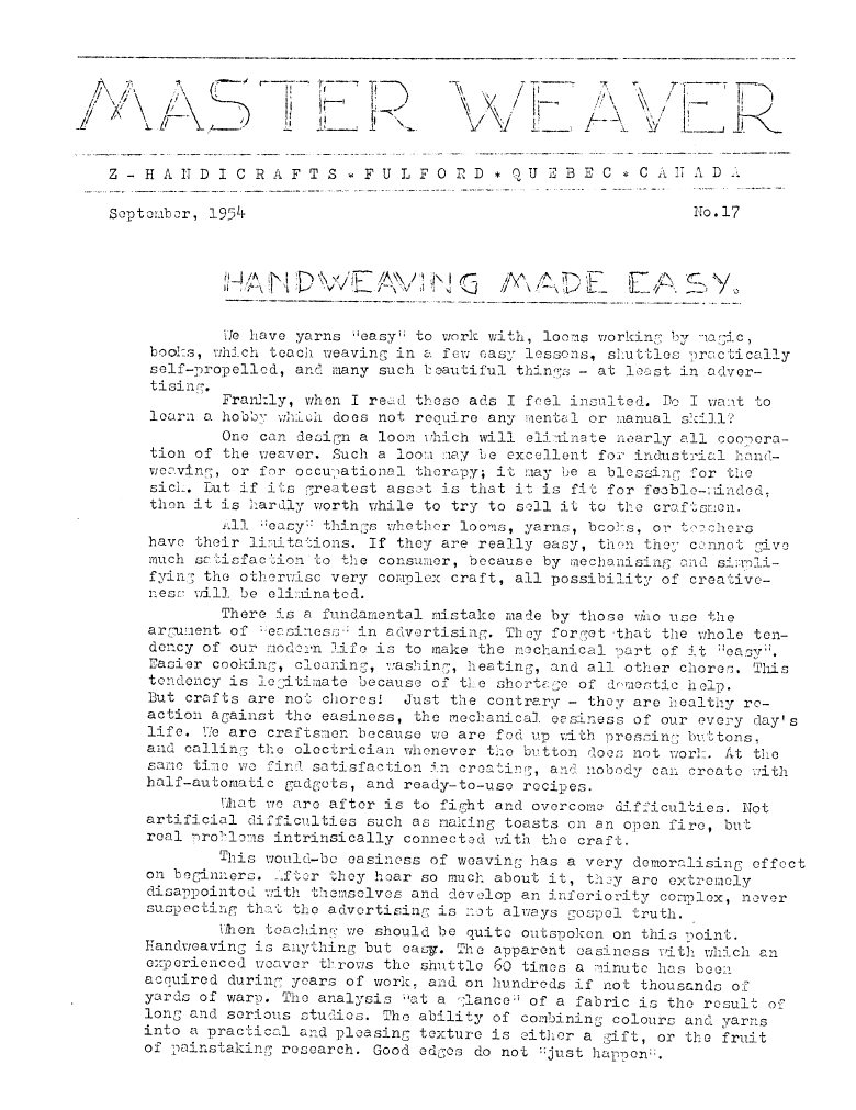 Handweaving Made Easy, ---. Master Weaver, No. 17 September 1954, 2 pages. Note: PDF provided by Judith Combs. By permission. Posted July 15, 2006. SAMPLE PAGE. File size 576 KB PDF