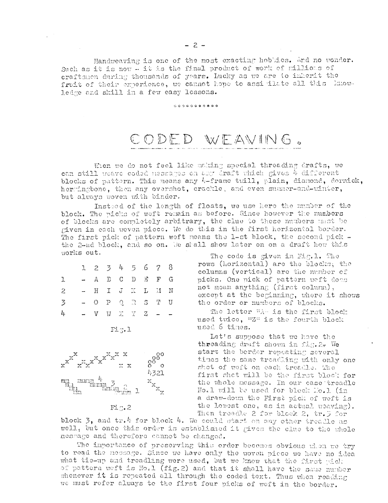 Coded Weaving, ---. Master Weaver, No. 17 September 1954, 2 pages. Note: PDF provided by Judith Combs. By permission. Posted July 15, 2006. SAMPLE PAGE. File size 578 KB PDF