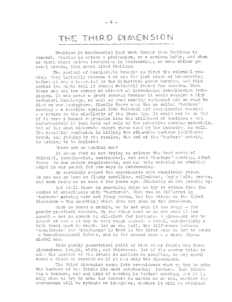 The Third Dimension, ---. Master Weaver, No. 17 September 1954, 5 pages. Note: PDF provided by Judith Combs. By permission. Posted July 15, 2006. SAMPLE PAGE. File size 957 KB PDF