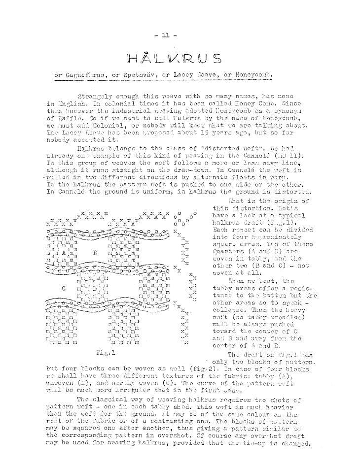 Hålkrus, or Gagnefkrus, or Spetsväv, or Lacey Weave, or Honeycomb, ---. Master Weaver, No. 17 September 1954, 2 pages. Note: PDF provided by Judith Combs. By permission. Posted July 15, 2006. SAMPLE PAGE. File size 574 KB PDF