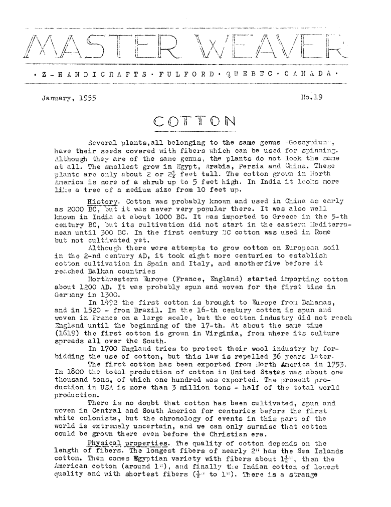 Cotton, ---. Master Weaver, No. 19 January 1955, 2 pages. Note: PDF provided by Judith Combs. By permission. Posted July 15, 2006. SAMPLE PAGE. File size 625 KB PDF