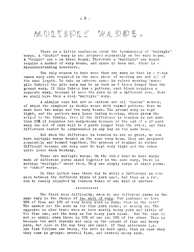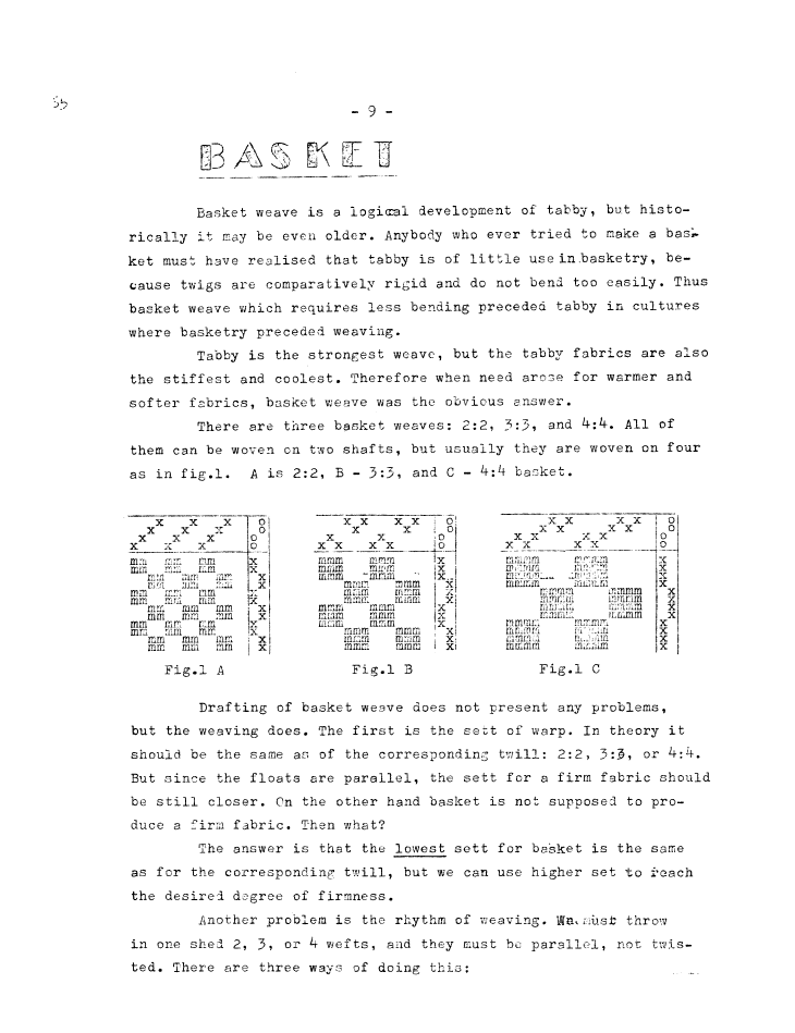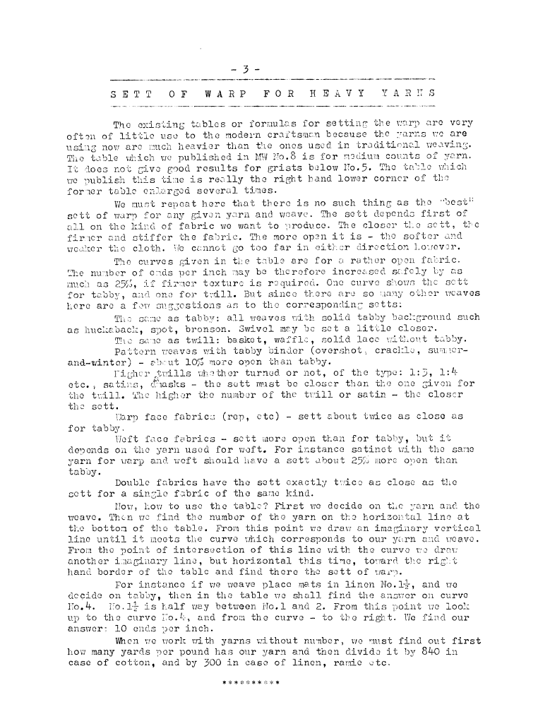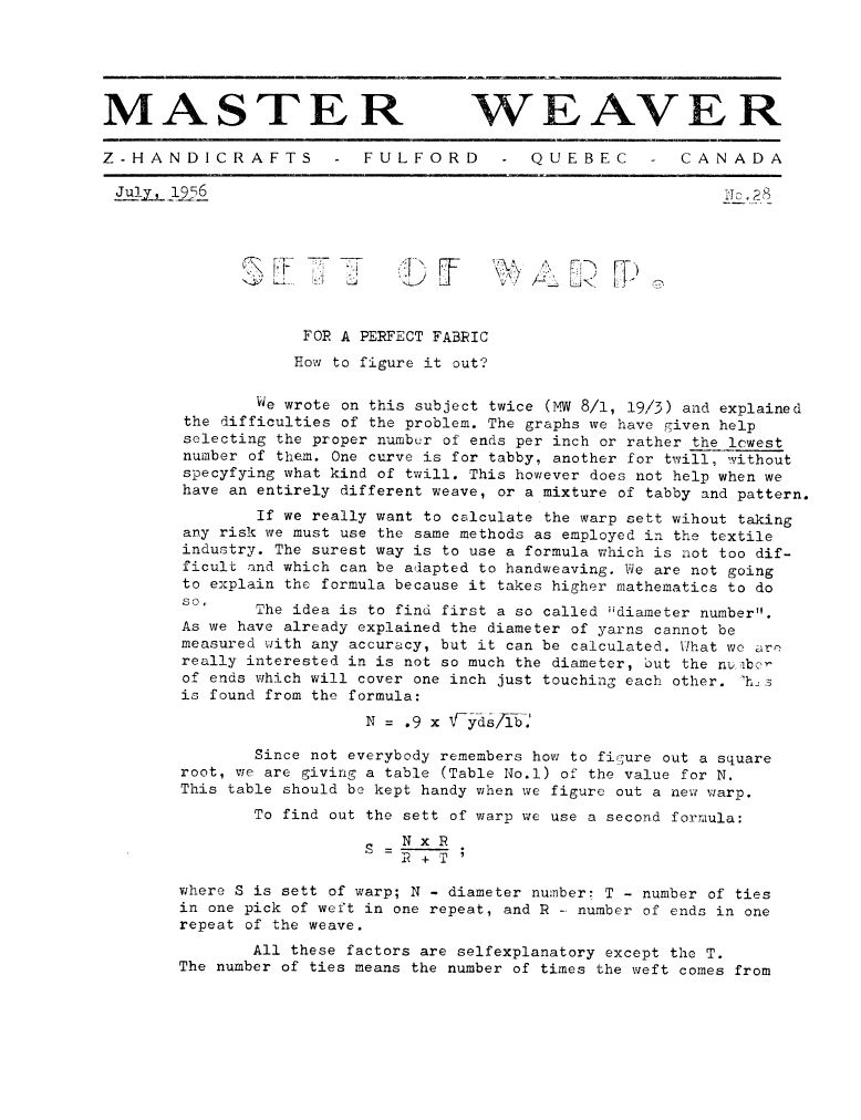 Sett of Warp for a Perfect Fabric, How to Figure it Out?, ---. Master Weaver, No. 28 July 1956, 3 pages. Note: PDF provided by Judith Combs. By permission. Posted July 15, 2006. SAMPLE PAGE. File size 602 KB PDF