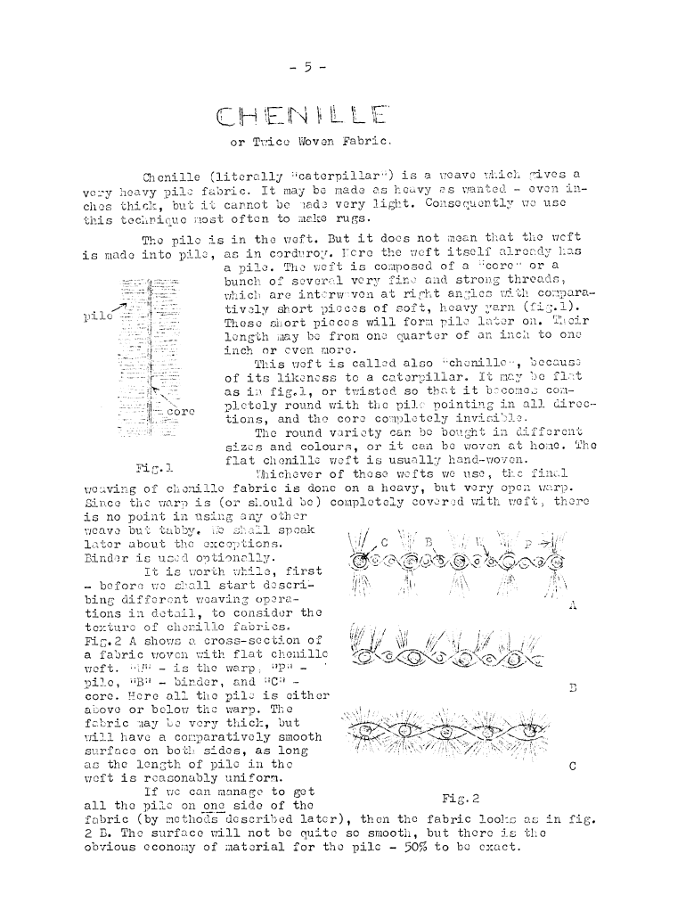 Chenille or Twice Woven Fabric, ---. Master Weaver, No. 19 January 1955, 6 pages. Note: PDF provided by Judith Combs. By permission. Posted July 15, 2006. SAMPLE PAGE. File size 927 KB PDF