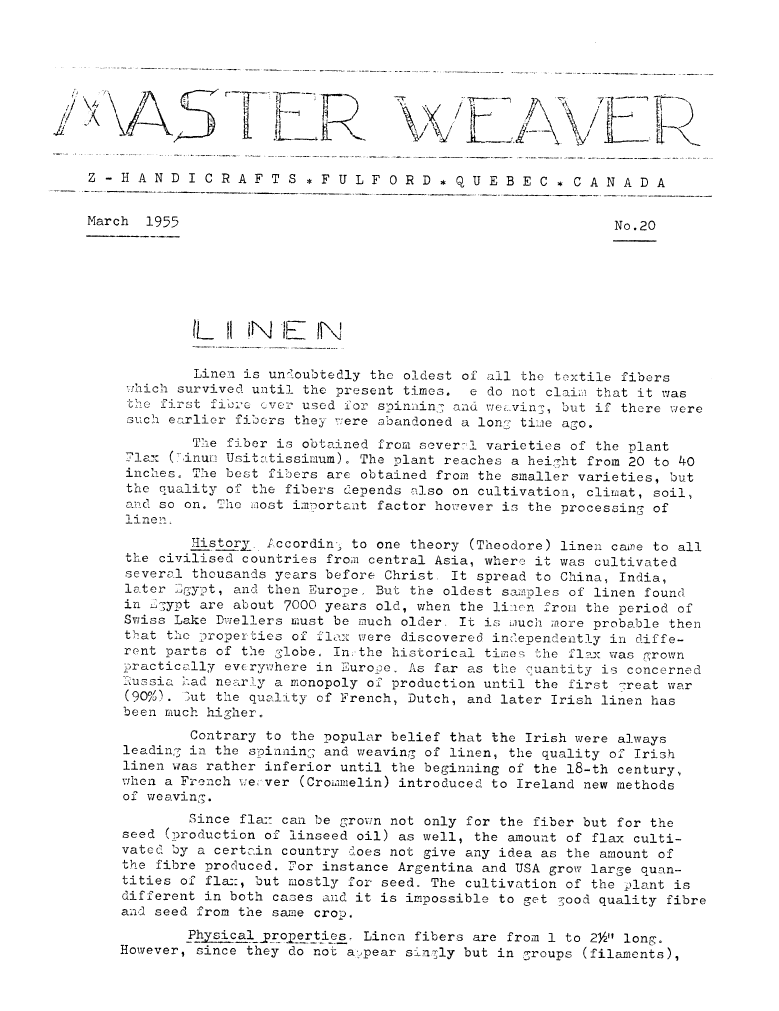 Linen, ---. Master Weaver, No. 20 March 1955, 2 pages. Note: PDF provided by Judith Combs. By permission. Posted July 15, 2006. SAMPLE PAGE. File size 559 KB PDF
