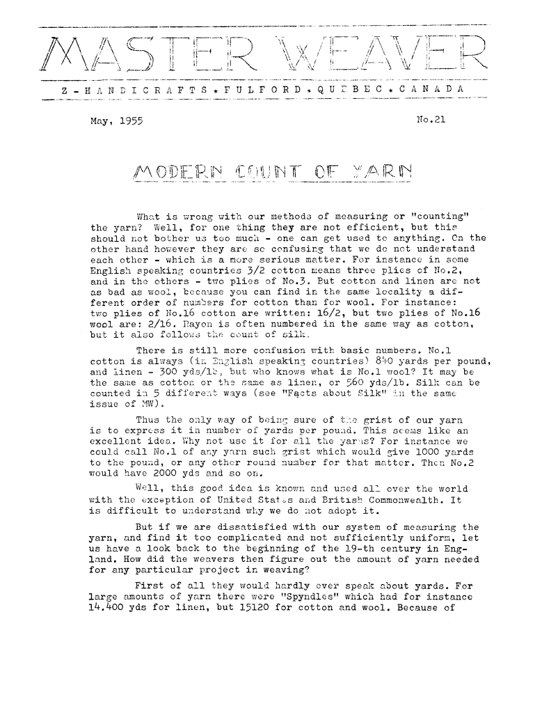 Modern Count of Yarn, ---. Master Weaver, No. 21 May 1955, 3 pages. Note: PDF provided by Judith Combs. By permission. Posted July 15, 2006. SAMPLE PAGE. File size 649 KB PDF