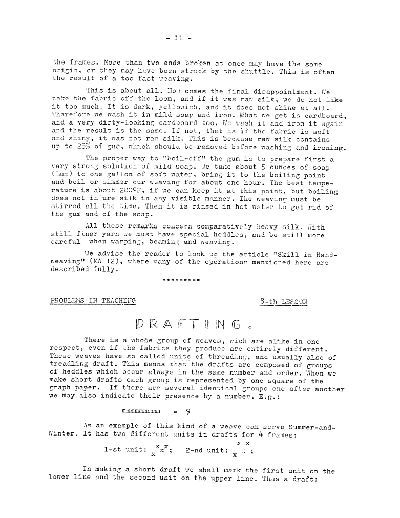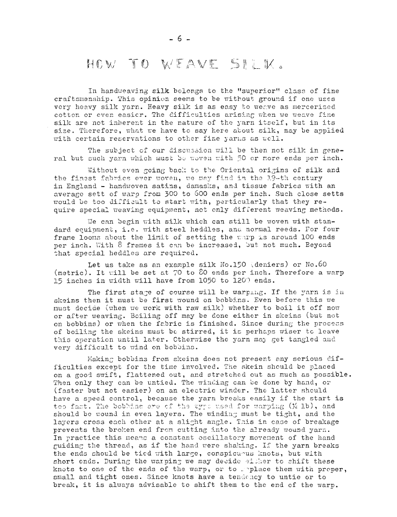 How to Weave Silk, ---. Master Weaver, No. 21 May 1955, 6 pages. Note: PDF provided by Judith Combs. By permission. Posted July 15, 2006. SAMPLE PAGE. File size 996 KB PDF