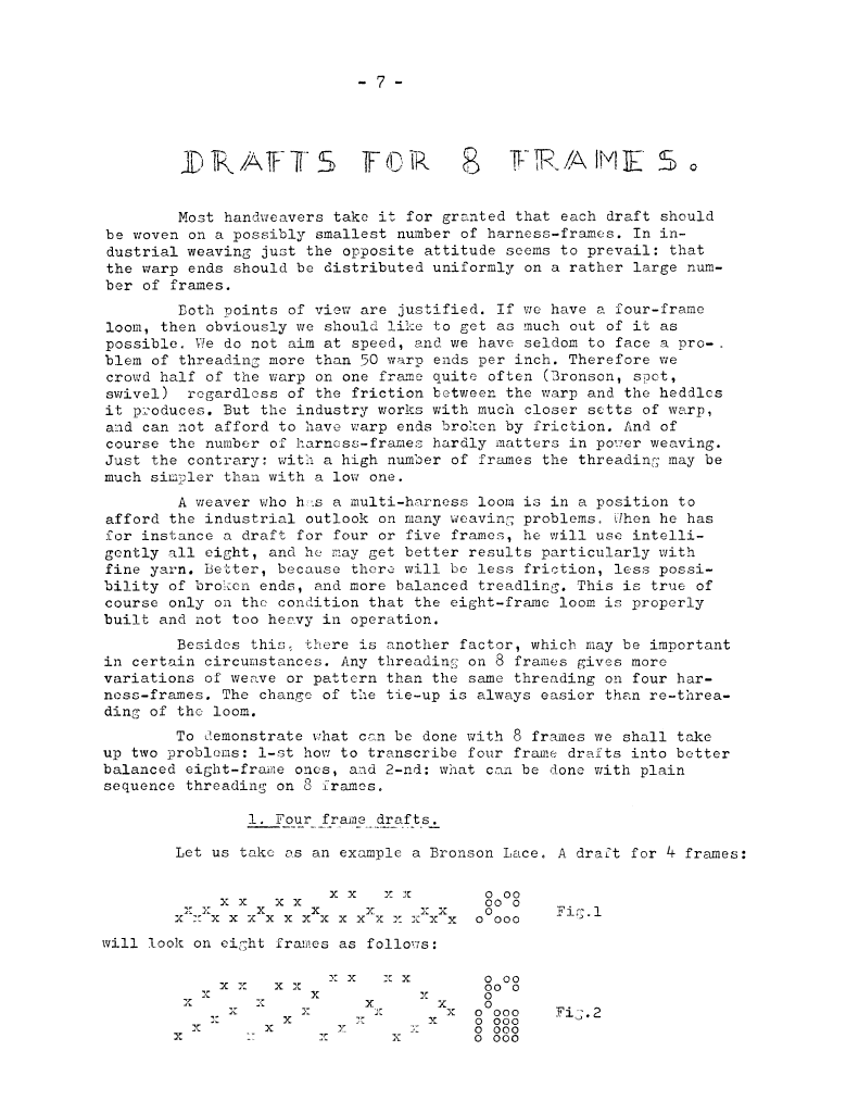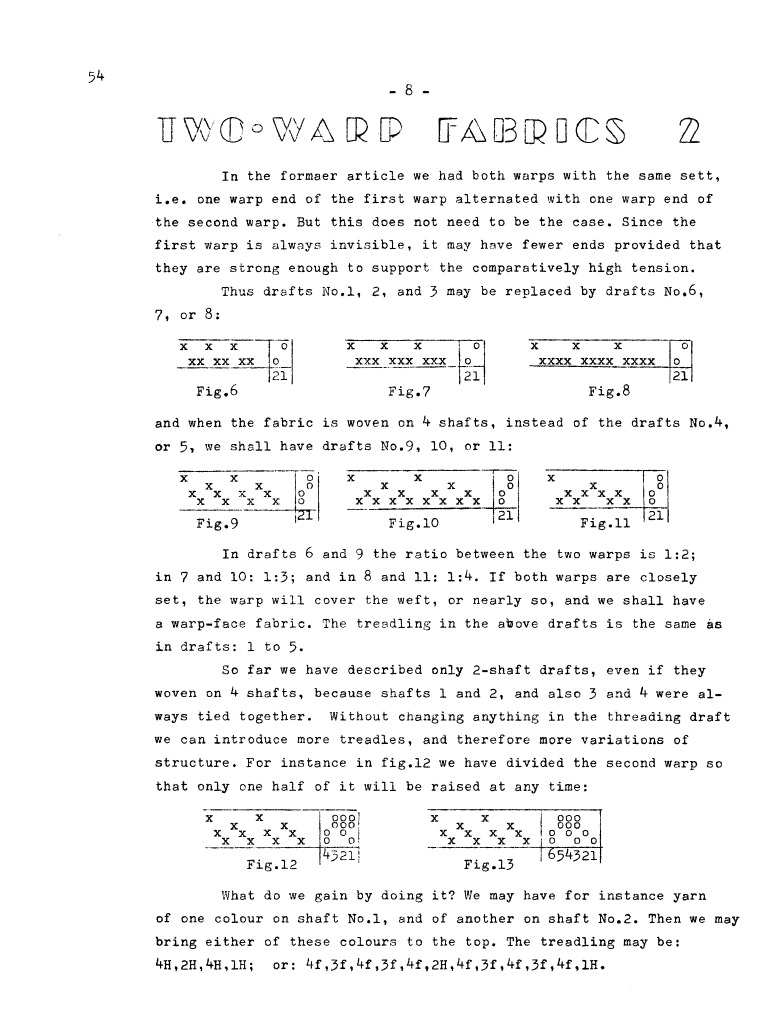 Drafts for 8 Frames, ---. Master Weaver, No. 22 July 1955, 4 pages. Note: PDF provided by Judith Combs. By permission. Posted July 15, 2006. SAMPLE PAGE. File size 698 KB PDF