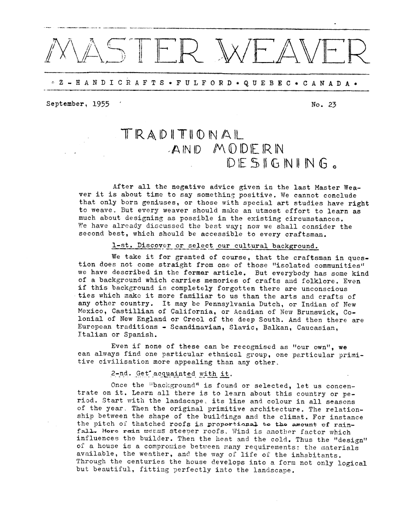 Traditional and Modern Designing, ---. Master Weaver, No. 23 September 1955, 5 pages. Note: PDF provided by Judith Combs. By permission. Posted July 15, 2006. SAMPLE PAGE. File size 895 KB PDF