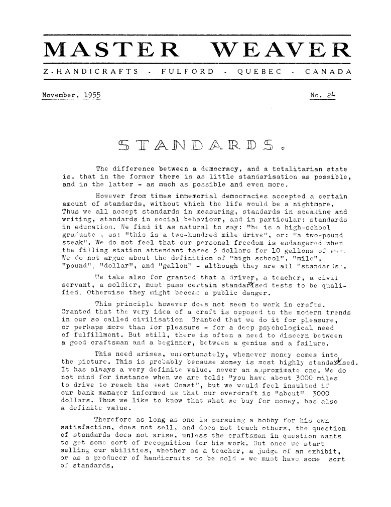 Standards, ---. Master Weaver, No. 24 November 1955, 3 pages. Note: PDF provided by Judith Combs. By permission. Posted July 15, 2006. SAMPLE PAGE. File size 681 KB PDF