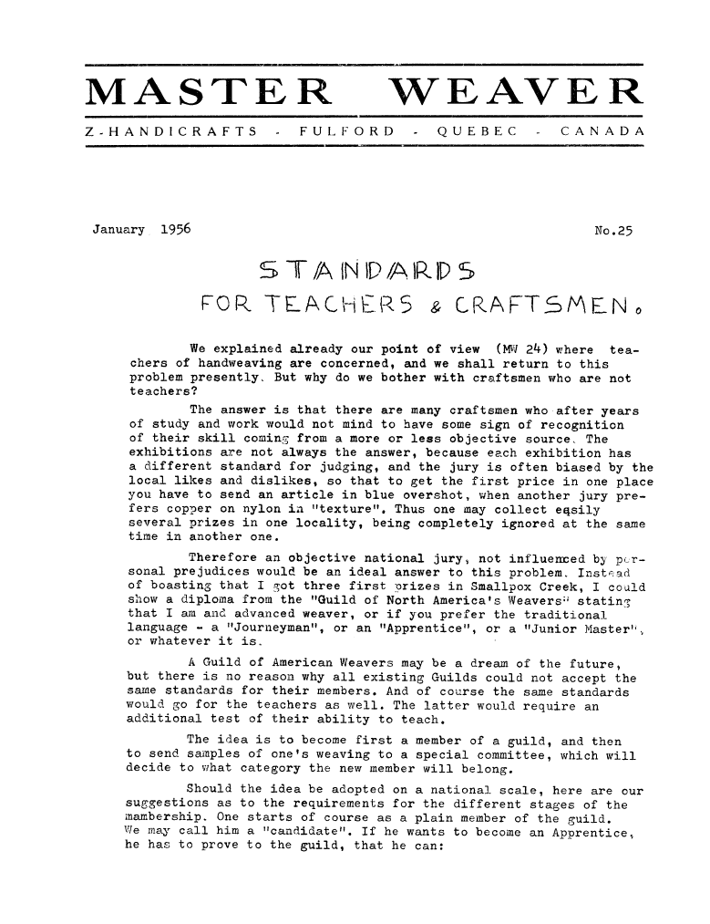 Standards for Teachers & Craftsmen, ---. Master Weaver, No. 25 January 1956, 3 pages. Note: PDF provided by Judith Combs. By permission. Posted July 15, 2006. SAMPLE PAGE. File size 631 KB PDF