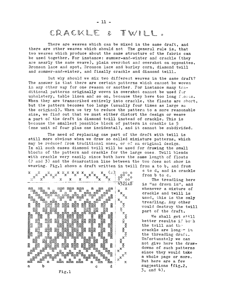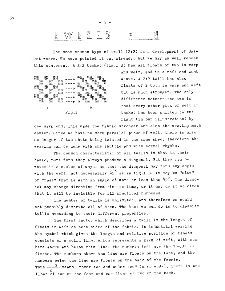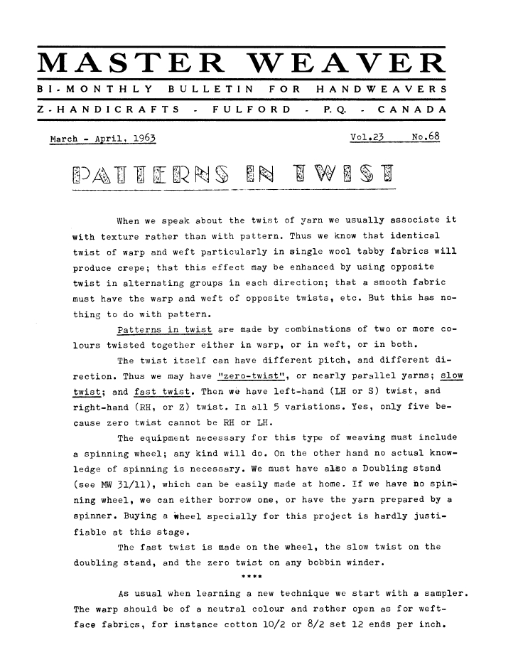 Twills - 1, ---. Master Weaver, No. 67 January 1963, 4 pages. Note: PDF provided by Judith Combs. By permission. Posted July 15, 2006. SAMPLE PAGE. File size 648 KB PDF
