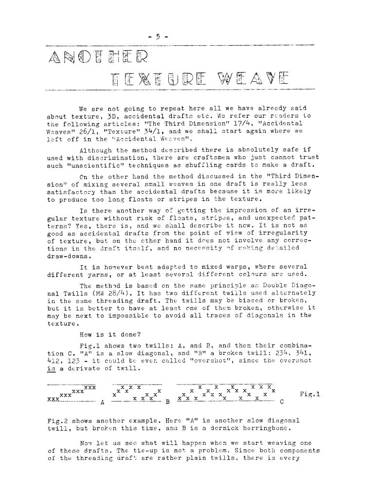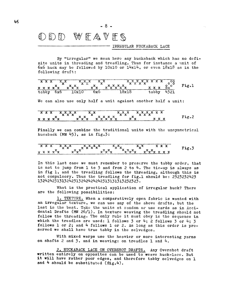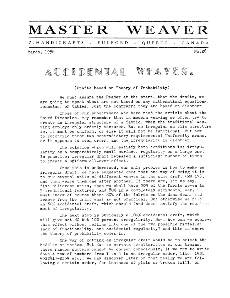 Accidental Weaves (Drafts based on Theory of Probability), ---. Master Weaver, No. 26 March 1956, 6 pages. Note: PDF provided by Judith Combs. By permission. Posted July 15, 2006. SAMPLE PAGE. File size 934 KB PDF