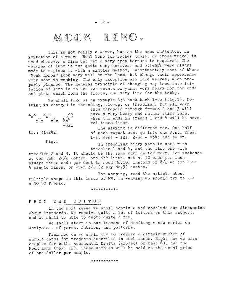 Mock Leno, ---. Master Weaver, No. 26 March 1956, 1 page. Note: PDF provided by Judith Combs. By permission. Posted July 15, 2006. SAMPLE PAGE. File size 484 KB PDF