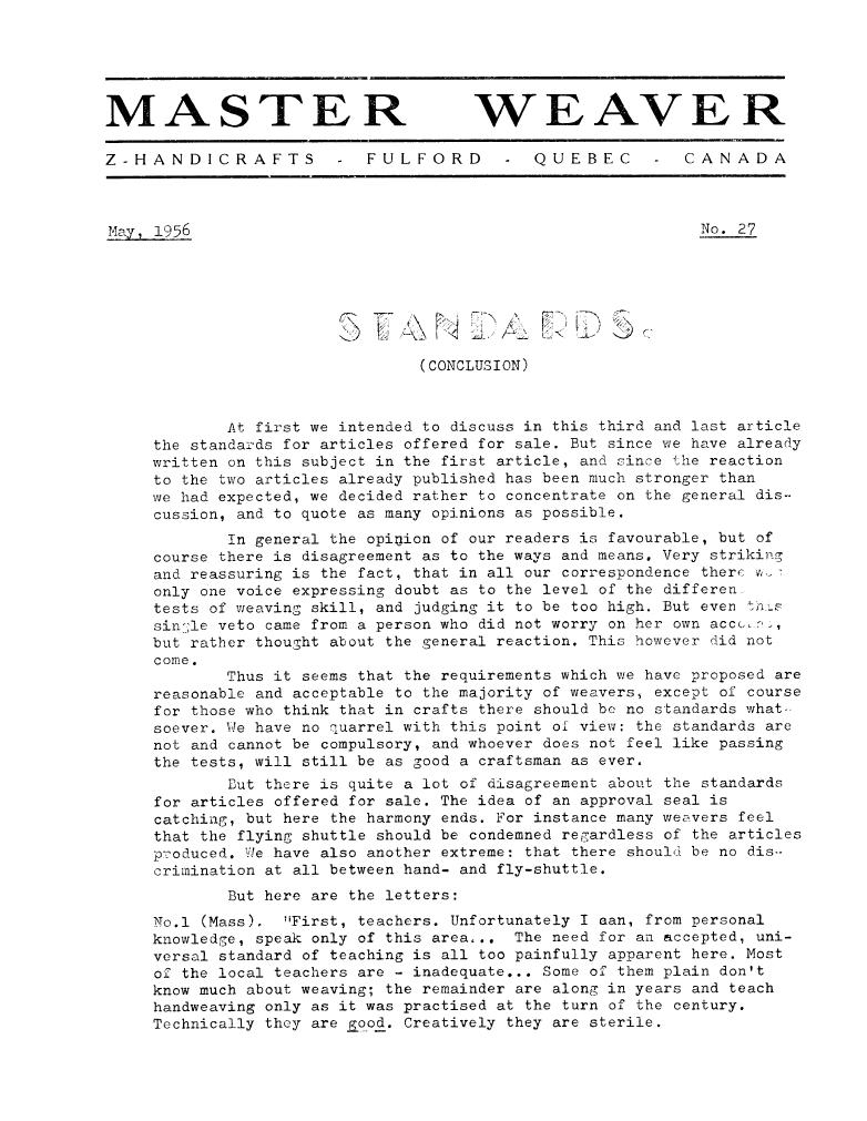 Standards (Conclusion), ---. Master Weaver, No. 27 May 1956, 4 pages. Note: PDF provided by Judith Combs. By permission. Posted July 15, 2006. SAMPLE PAGE. File size 814 KB PDF