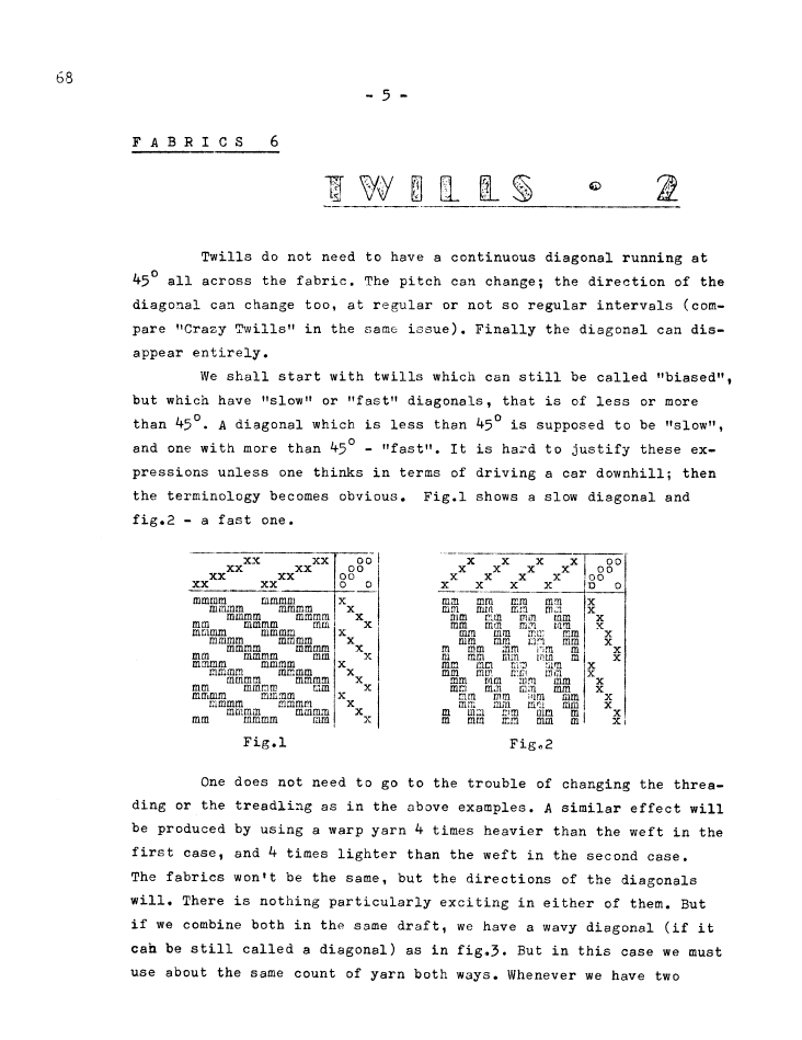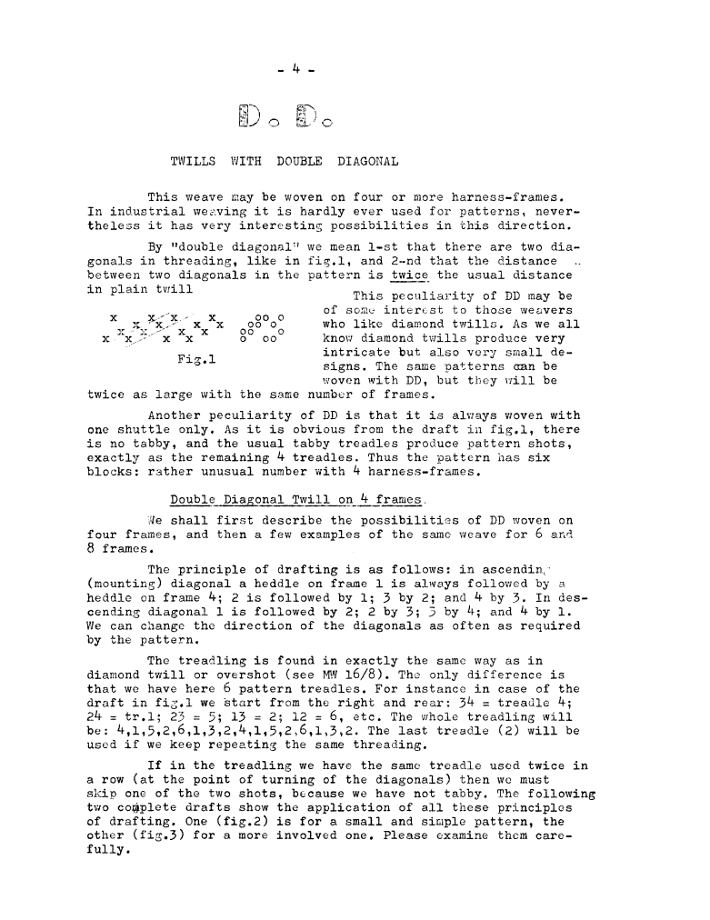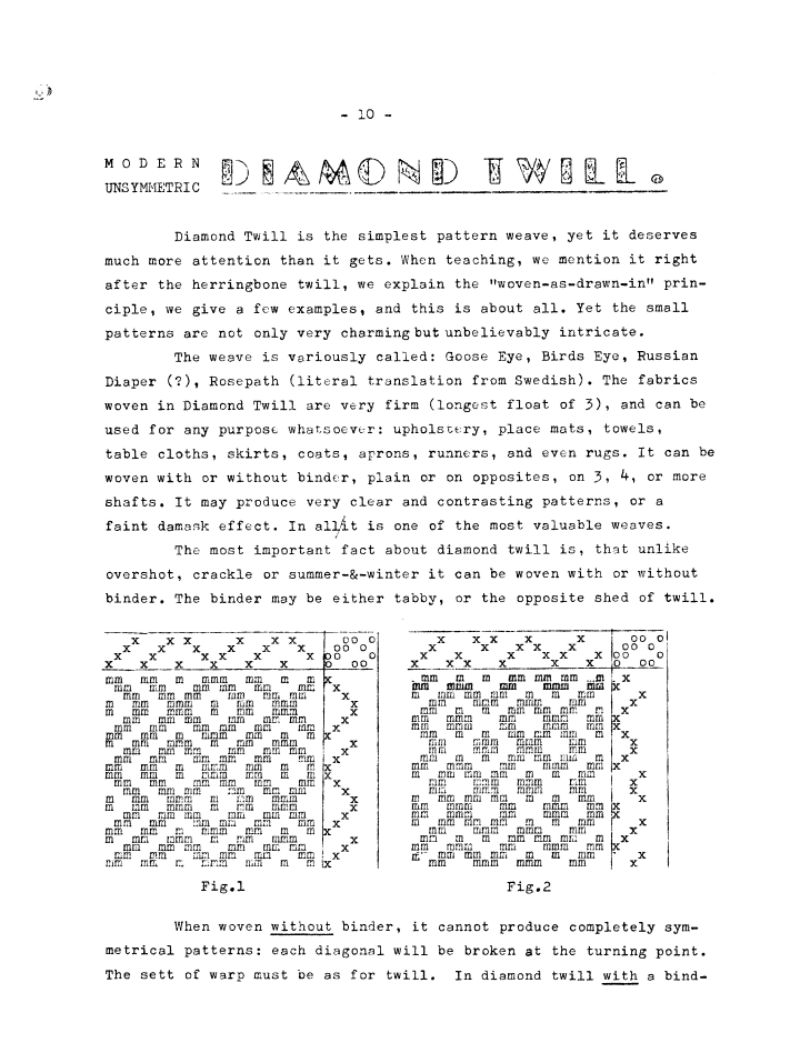D.D. Twills with Double Diagonal, ---. Master Weaver, No. 28 July 1956, 5 pages. Note: PDF provided by Judith Combs. By permission. Posted July 15, 2006. SAMPLE PAGE. File size 828 KB PDF