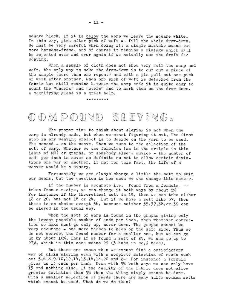 Compound Sleying, ---. Master Weaver, No. 28 July 1956, 2 pages. Note: PDF provided by Judith Combs. By permission. Posted July 15, 2006. SAMPLE PAGE. File size 572 KB PDF