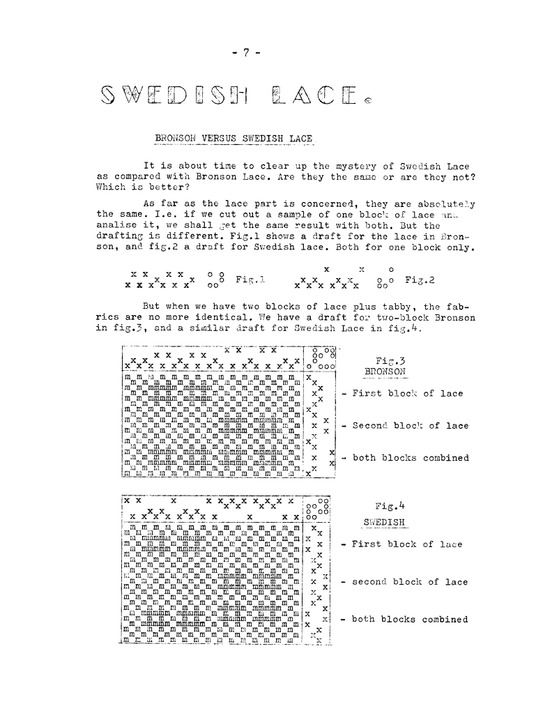 Swedish Lace, Bronson versus Swedish Lace, ---. Master Weaver, No. 29 September 1956, 4 pages. Note: PDF provided by Judith Combs. By permission. Posted July 15, 2006. SAMPLE PAGE. File size 726 KB PDF