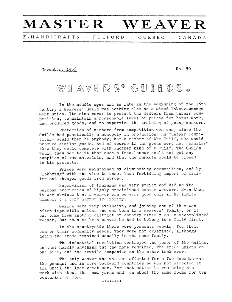 Weavers' Guilds, ---. Master Weaver, No. 30 November 1956, 3 pages. Note: PDF provided by Judith Combs. By permission. Posted July 15, 2006. SAMPLE PAGE. File size 723 KB PDF
