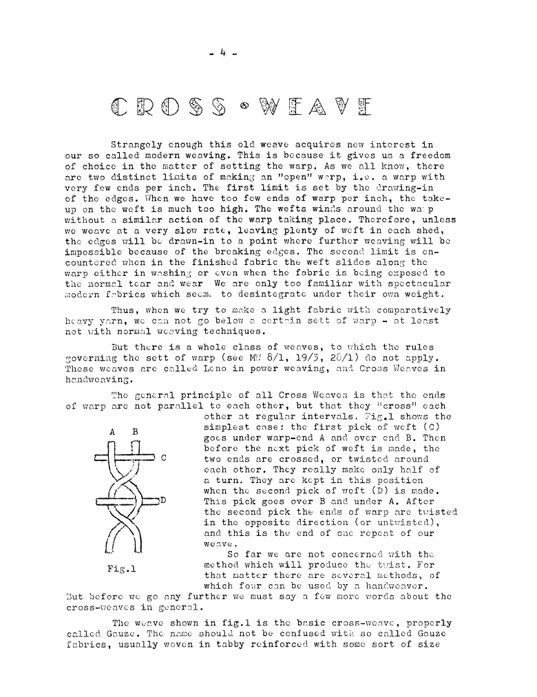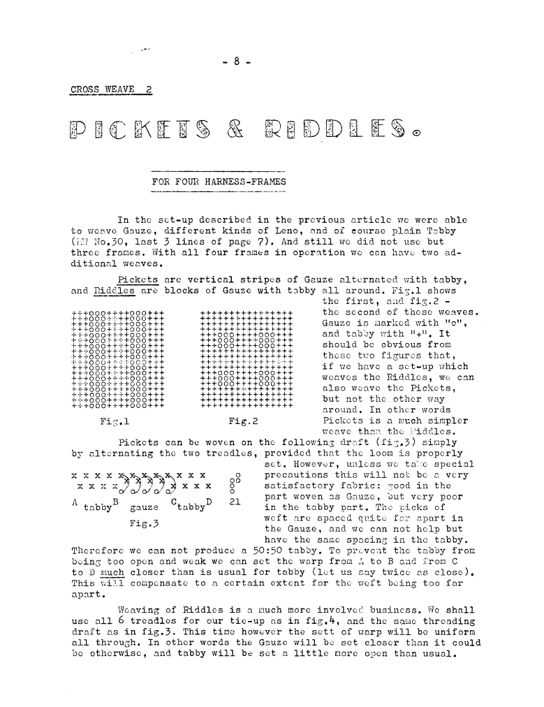 Cross Weave 2 - Pickets & Riddles for Four Harness-Frames, ---. Master Weaver, No. 31 January 1957, 3 pages. Note: PDF provided by Judith Combs. By permission. Posted July 15, 2006. SAMPLE PAGE. File size 639 KB PDF