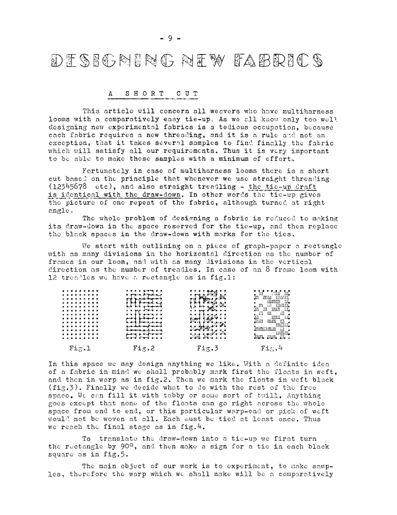 Designing New Fabrics A Short Cut, ---. Master Weaver, No. 30 November 1956, 2 pages. Note: PDF provided by Judith Combs. By permission. Posted July 15, 2006. SAMPLE PAGE. File size 593 KB PDF