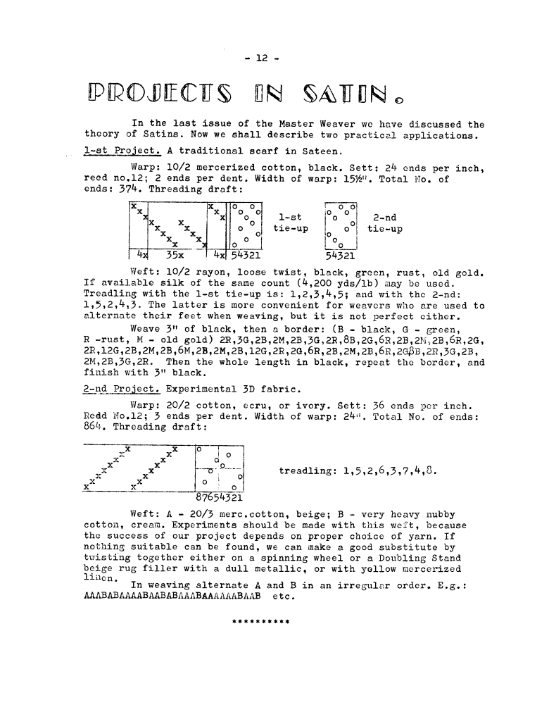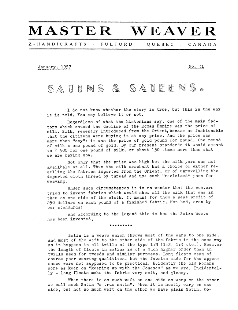 Satins & Sateens, ---. Master Weaver, No. 31 January 1957, 4 pages. Note: PDF provided by Judith Combs. By permission. Posted July 15, 2006. SAMPLE PAGE. File size 717 KB PDF