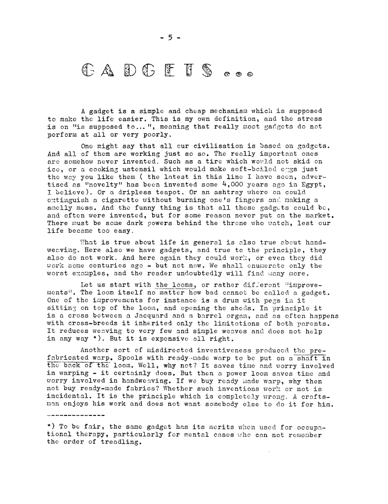 Gadgets, ---. Master Weaver, No. 31 January 1957, 3 pages. Note: PDF provided by Judith Combs. By permission. Posted July 15, 2006. SAMPLE PAGE. File size 708 KB PDF