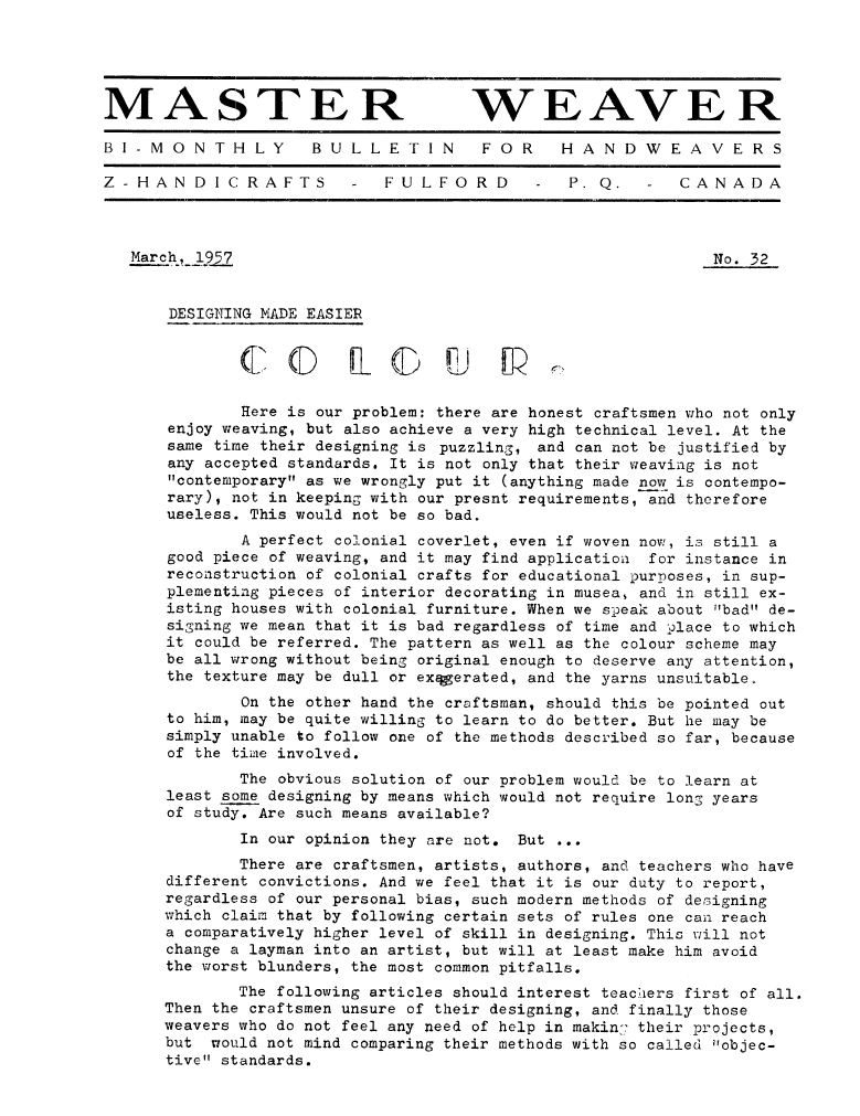 Designing Made Easier - Colour, ---. Master Weaver, No. 32 March 1957, 5 pages. Note: PDF provided by Judith Combs. By permission. Posted July 15, 2006. SAMPLE PAGE. File size 954 KB PDF