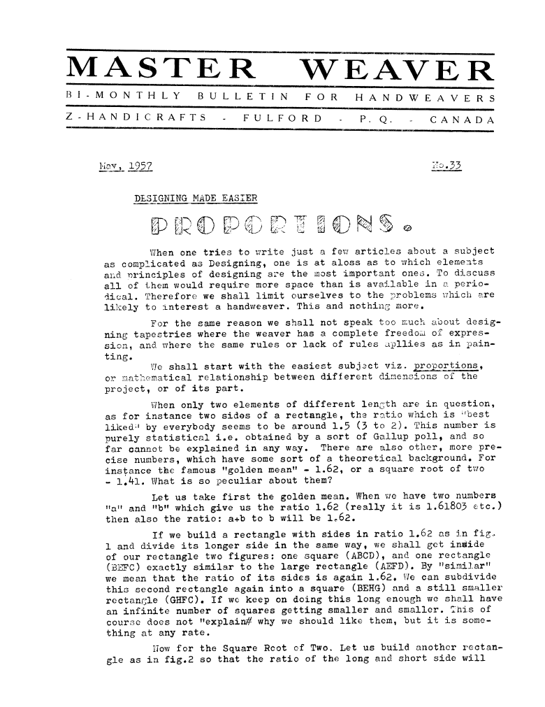 Designing Made Easier - Proportions, ---. Master Weaver, No. 33 May 1957, 4 pages. Note: PDF provided by Judith Combs. By permission. Posted July 15, 2006. SAMPLE PAGE. File size 755 KB PDF