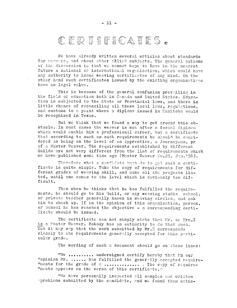 Certificates, ---. Master Weaver, No. 33 May 1957, 2 pages. Note: PDF provided by Judith Combs. By permission. Posted July 15, 2006. SAMPLE PAGE. File size 545 KB PDF