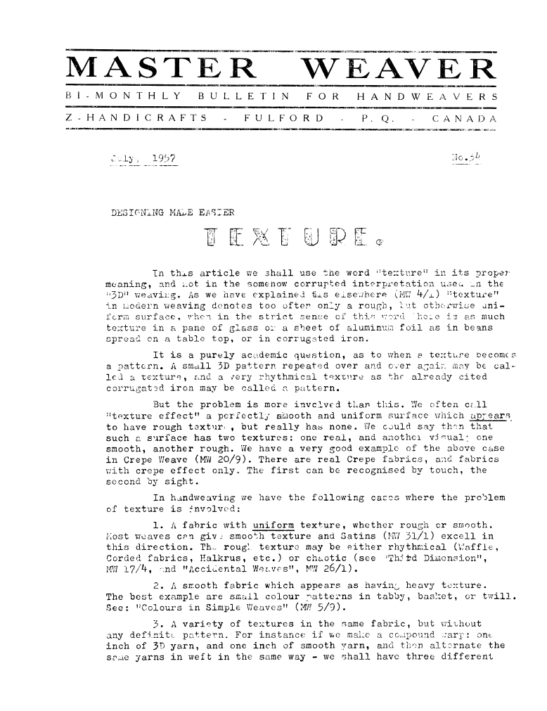 Designing Made Easier - Texture, ---. Master Weaver, No. 34 July 1957, 4 pages. Note: PDF provided by Judith Combs. By permission. Posted July 15, 2006. SAMPLE PAGE. File size 692 KB PDF