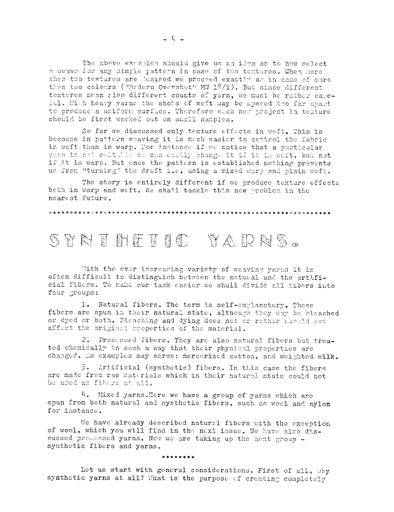 Synthetic Yarns, ---. Master Weaver, No. 34 July 1957, 3 pages. Note: PDF provided by Judith Combs. By permission. Posted July 15, 2006. SAMPLE PAGE. File size 636 KB PDF