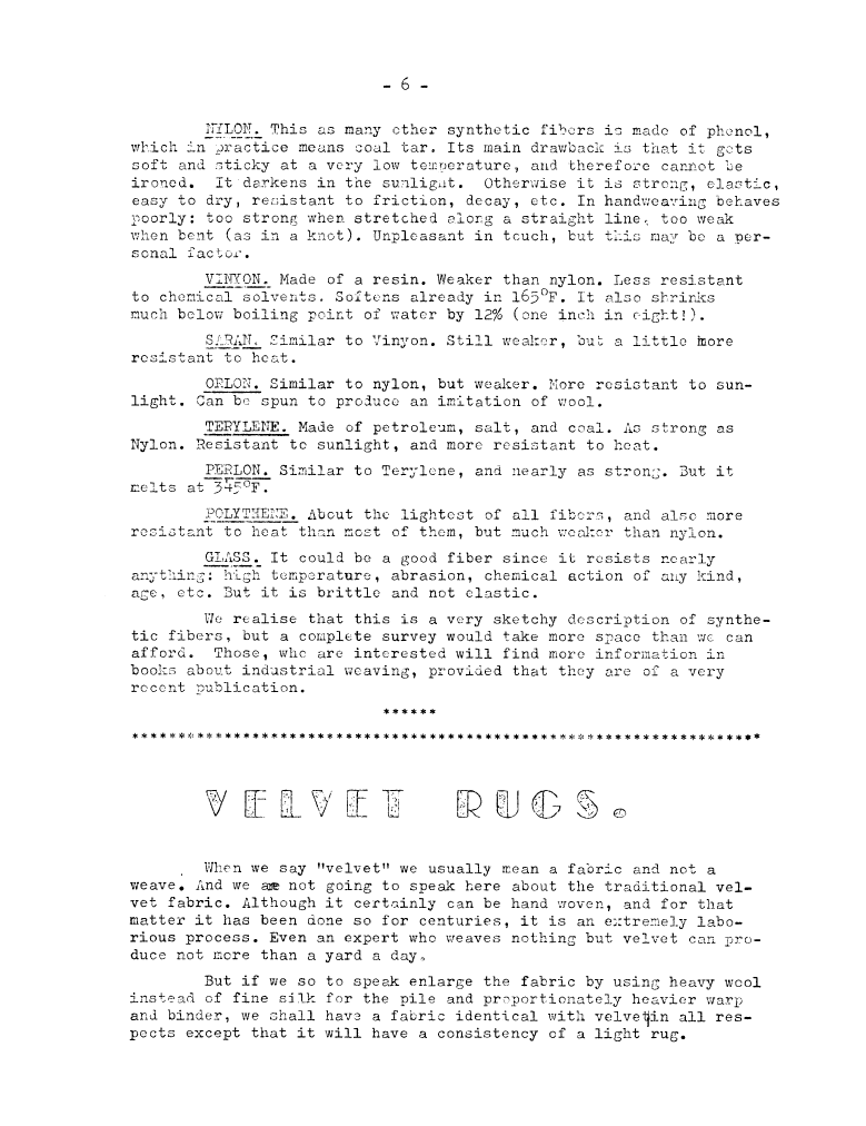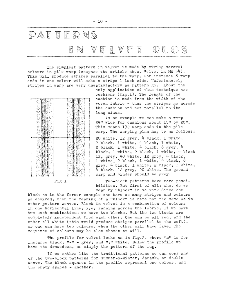 Velvet Rugs, ---. Master Weaver, No. 34 July 1957, 5 pages. Note: PDF provided by Judith Combs. By permission. Posted July 15, 2006. SAMPLE PAGE. File size 782 KB PDF