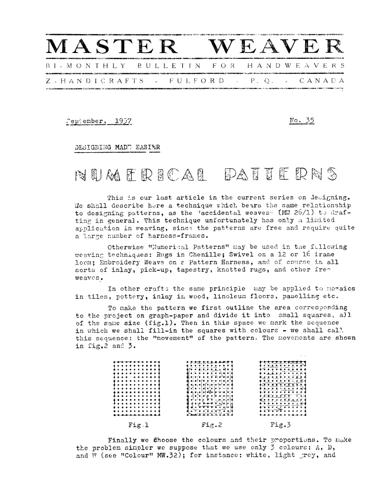 Designing Made Easier - Numerical Patterns, ---. Master Weaver, No. 35 September 1957, 4 pages. Note: PDF provided by Judith Combs. By permission. Posted July 15, 2006. SAMPLE PAGE. File size 761 KB PDF