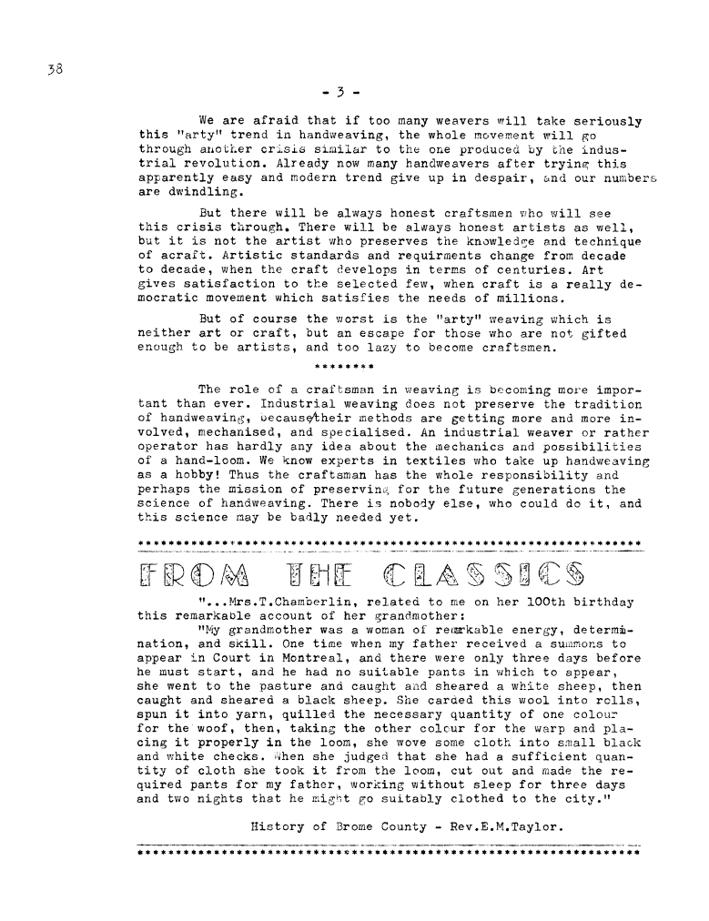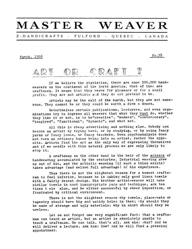 Art or Craft?, ---. Master Weaver, No. 38 March 1958, 3 pages. Note: PDF provided by Judith Combs. By permission. Posted July 15, 2006. SAMPLE PAGE. File size 703 KB PDF