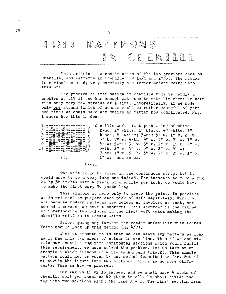 Free Patterns in Chenille, ---. Master Weaver, No. 38 March 1958, 4 pages. Note: PDF provided by Judith Combs. By permission. Posted July 15, 2006. SAMPLE PAGE. File size 778 KB PDF