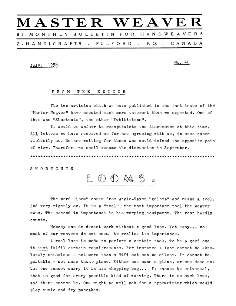 Shortcuts - Looms, ---. Master Weaver, No. 40 July 1958, 4 pages. Note: PDF provided by Judith Combs. By permission. Posted July 15, 2006. SAMPLE PAGE. File size 686 KB PDF