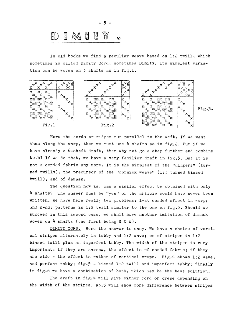 Dimity, ---. Master Weaver, No. 40 July 1958, 5 pages. Note: PDF provided by Judith Combs. By permission. Posted July 15, 2006. SAMPLE PAGE. File size 812 KB PDF