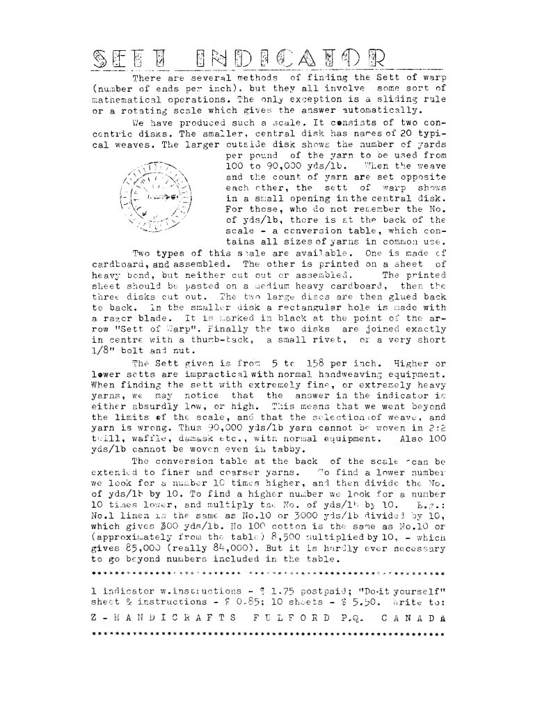 Sett Indicator, ---. Master Weaver, No. 40 July 1958, 1 page. Note: PDF provided by Judith Combs. By permission. Posted July 15, 2006. SAMPLE PAGE. File size 505 KB PDF