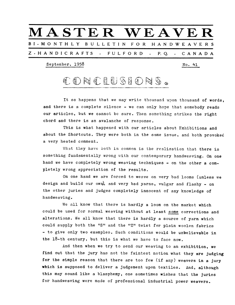 Conclusions, ---. Master Weaver, No. 41 September 1958, 4 pages. Note: PDF provided by Judith Combs. By permission. Posted July 15, 2006. SAMPLE PAGE. File size 752 KB PDF