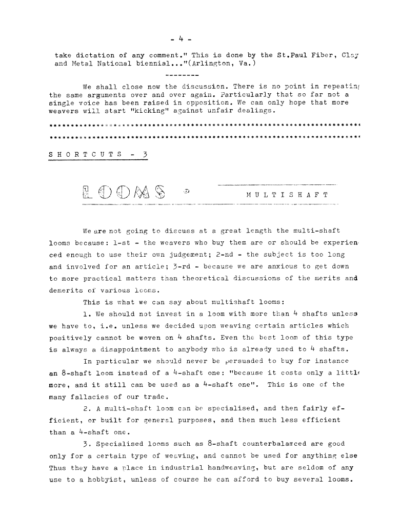 Shortcuts 3 - Looms Multishaft, ---. Master Weaver, No. 41 September 1958, 6 pages. Note: PDF provided by Judith Combs. By permission. Posted July 15, 2006. SAMPLE PAGE. File size 873 KB PDF